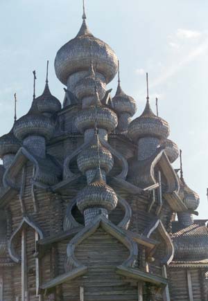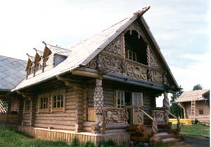 Later today, Friday, we stopped for lunch at Mandrogi where a more contemporary entrepreneur is building a hunting lodge, a vodka museum, gift shops, and a half a dozen homes for hunters -- all on speculation, all using the very same log-assembly techniques that we saw a day earlier on Kizhi Island. We were his guest for a lunch of shashlick barbecued in the open grill. They had benches covered with a birch supported system of plastic awnings. Most of the food came from the boat, but the entrepreneur provided local entertainment in a little "shell" hewn out of pine beams. The wood craftsmanship is very good. With a little more equipment, their productivity would be even more impressive.