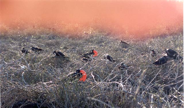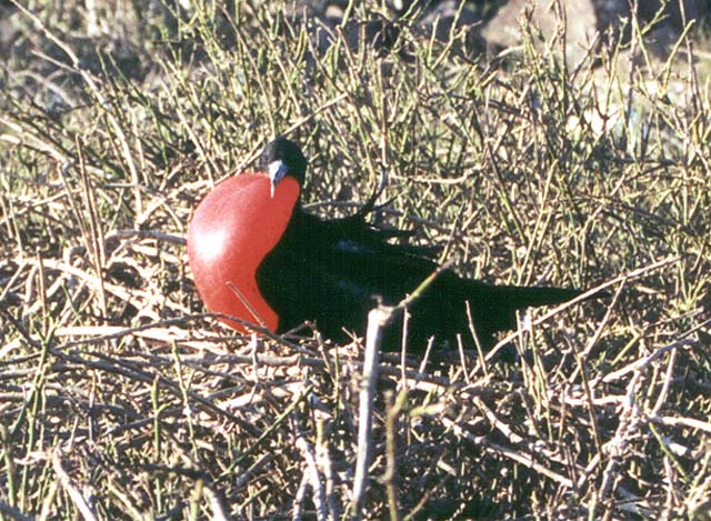 Especially interesting were the magnificent frigate birds (photo, below right) - the males have the bright red gills that are inflated with air to attract females. We saw a number of "late blooming" frigate birds, still trying to attract females to their chosen nesting area, long after mating season is over in spring (photo, below left).