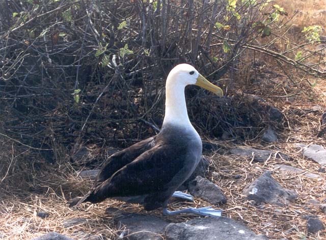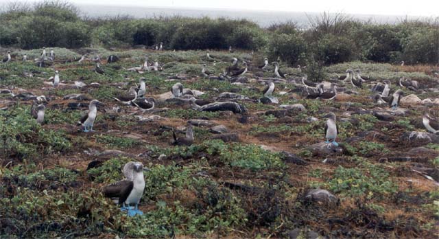 Hood Island (Espanola) - west coast Punta Suarez - colonies of masked and blue-footed boobies; beach colony of (colorful) marine iguana and large lava lizards; endemic Albatross colony; Gardner Bay - blowholes and white sand beach.