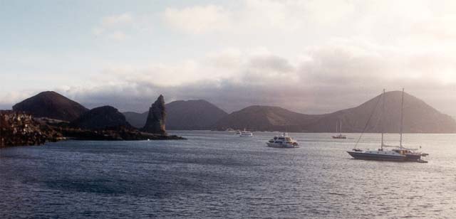In the afternoon, about 3, we went by panga to the base of the volcano on Bartolome and hiked up about 320 feet to the top. A grand view of the Pinnacle Rock and the ships in the distance.