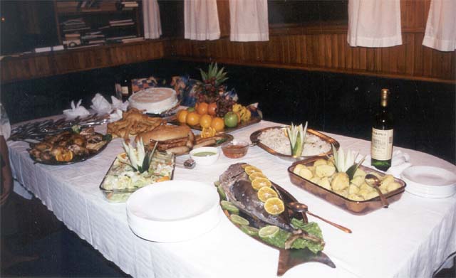 At dinner, the crew outdid themselves with a banquet so gloriously presented that everyone had to desert the table, go get the camera and photograph the table and the farewell cake. A most generous meal.